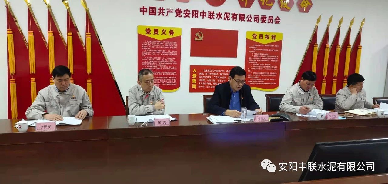 按照中國聯(lián)合水泥黨委關(guān)于認(rèn)真開好2020年度民主生活會通知要求,2月24日上午,安陽中聯(lián)2020年度黨員領(lǐng)導(dǎo)班子民主生活會在公司黨員活動室召開。中國建材股份黨委常委、執(zhí)行董事、副總裁,中國聯(lián)合水泥黨委書記、董事長崔星太通過視頻連線督導(dǎo)會議并作點(diǎn)評講話。中國聯(lián)合水泥黨群工作部主任侯萍、紀(jì)檢監(jiān)察室副主任董治及安陽中聯(lián)黨委委員、領(lǐng)導(dǎo)班子成員參加會議。安陽中聯(lián)黨委書記、總經(jīng)理黃頌高主持會議。